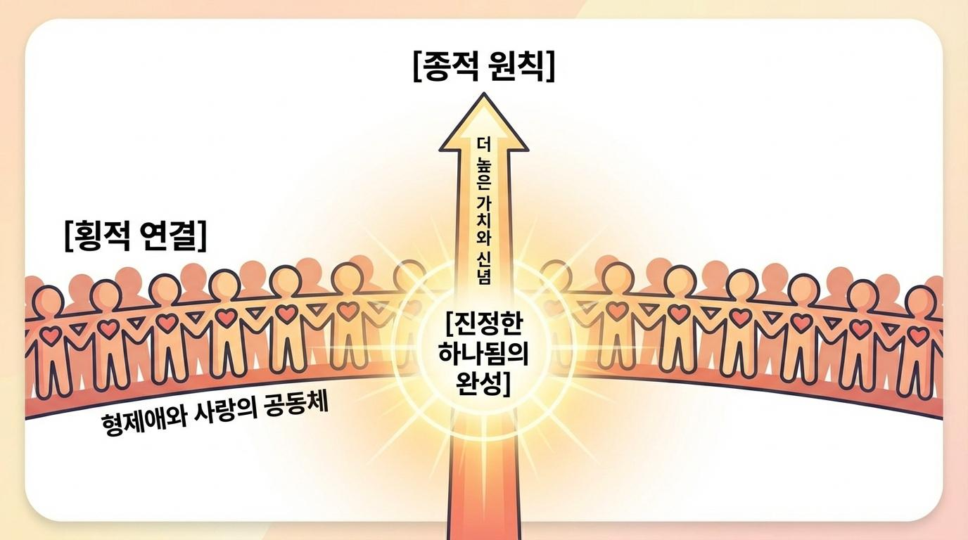 그렇다면 이 진정한 하나됨은 어떻게 완성될 수 있을까요? 그것은 단순한 인간적 친목만으로는 이루어질 수 없습니다. 바로 개인의 굳건한 내면의 원칙(종적 관계)과 타인과의 따뜻한 관계(수평적 하나됨)가 올바로 교차하며 바로 설 때, 비로소 모두가 감동하는 참된 하나됨이 완성되는 것입니다. 우리는 때때로 이 중요한 균형을 잃은 두 가지 모습을 보게 됩니다. 자신의 신념과 원칙은 매우 확고하지만, 사람들과 자주 부딪히고 주변에 상처를 주는 사람이 있습니다. 또 반대로 사람들과는 잘 지내지만, 공적인 기준이 흐려져 본래의 목표를 잃거나 공동체가 본질적인 의미를 잃는 경우도 있습니다. 이 둘은 모두 절반만 세워진 리더십입니다. 개인의 심오한 원칙과 공동체를 향한 따뜻한 사랑, 이 두 가지가 반드시 함께 가야만 우리는 완전한 리더로 설 수 있습니다. 그리고 반드시 기억해야 할 것은 그 순서입니다. 내면의 원칙이 먼저 확립되고, 그 위에 수평적 하나됨이 세워져야 합니다. 자신의 뜻이 아니라 더 큰 이상과 공동체의 선을 위한 삶을 살아가는 것, 이것이 바로 내면의 원칙이 무엇이며, 그것을 어떻게 세워야 하는지를 가장 분명하게 보여주는 길잡이입니다. 이 두 가지가 여러분 안에서 하나로 엮일 때, 비로소 공동체를 승리적으로 이끌 참된 길이 열리게 되는 것입니다.