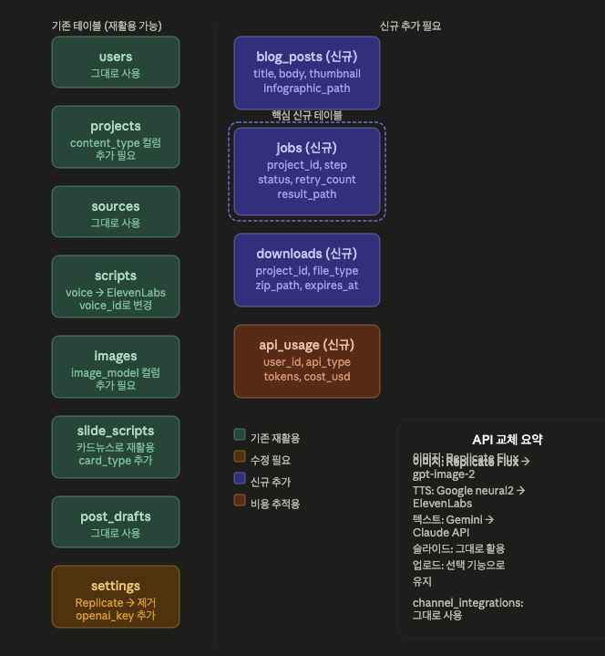 추가 — 블로그용인지, 쇼츠용인지, 인스타용인지 구분하는 컬럼 하나만 있으면 같은 파이프라인을 다양하게 활용할 수 있습니다.