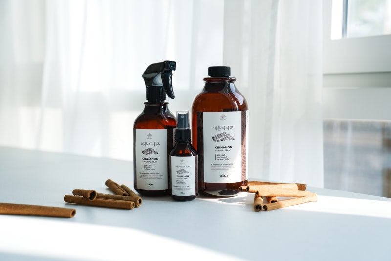 "props": "a few cinnamon sticks scattered on the table near the products (2–8 pieces), minimal and tidy",