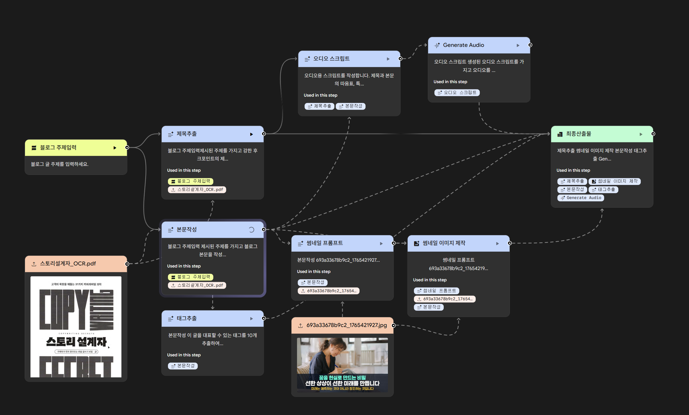 그렇다고 제한없이 무료 사용은 아닌듯한데, 그동안 Gemini를 통해 글을 쓰고 썸네일 만들고 오디오 만드는 일들을 모두 수작업으로 했다면, Opal에서 앱을 만들어 적절히 일을 시키면 왠만한 수준의 결과물을 내 준다. 아직 웹훅이나 DB 연동 등의 기능은 없어 블로그에 자동 등록까지는 안되지만 그래도 썸네일, 오디오 생성까지 자동으로 되니 그게 어디인가..